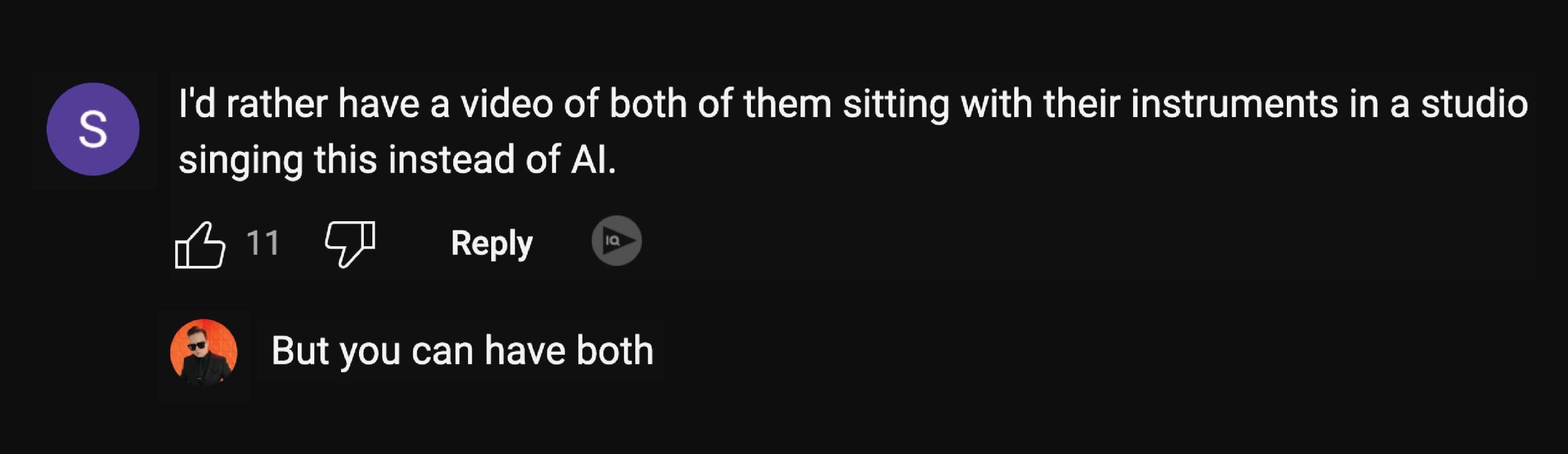 Interesting to note the tone of the comments on this video. One in particular exemplifies a particular attitude a lot of people have towards AI art in general (I couldn’t resist replying):