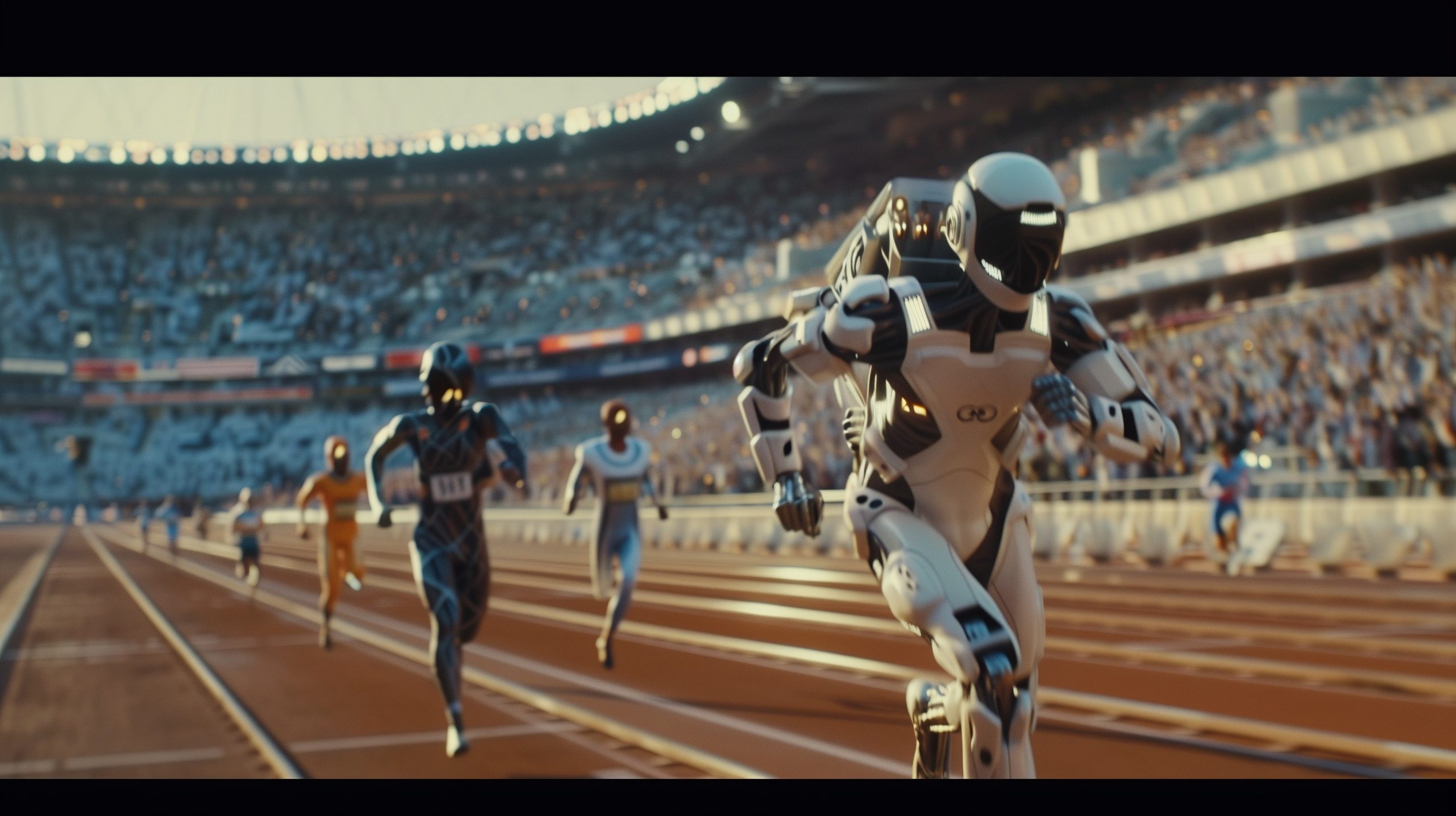 A thrilling moment from a 1990s sports movie, depicting a race between runners on a packed Olympic track. The lead runner is a humanoid robot. Dressed in authentic Olympic gear. Created Using: nostalgic 90s film vibes, dynamic racing action, crowded stadium atmosphere, vivid sports uniforms, intense competition, vintage robot aesthetics, emotional storytelling, cinematic lighting, hd quality, natural look, in an inspirational 1990s sports movie