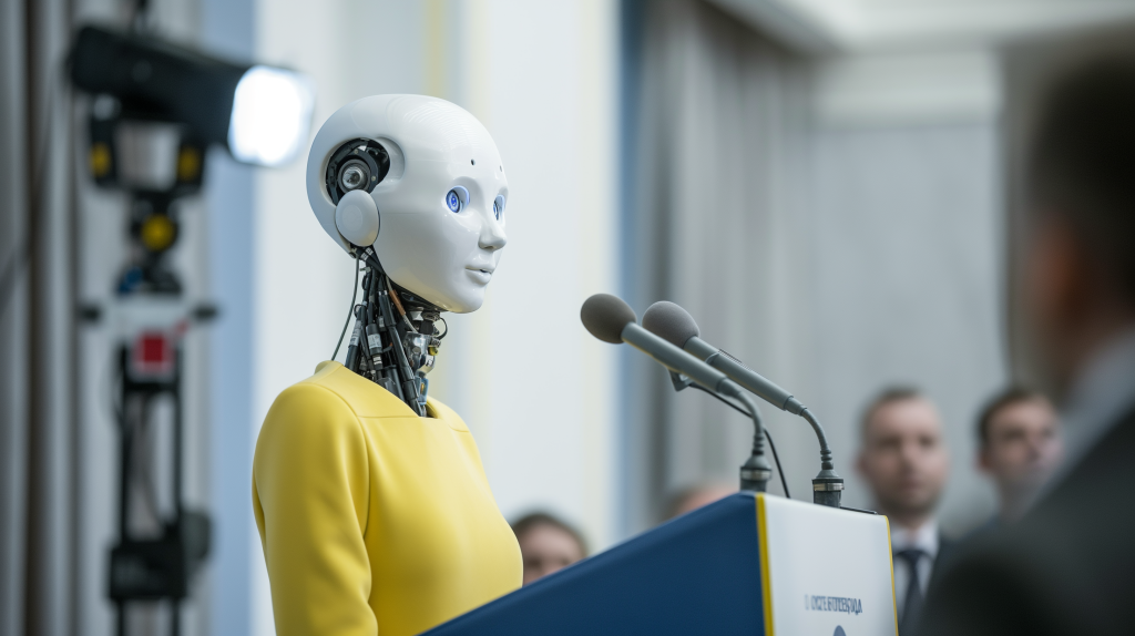 cinematic image of the robot, standing at the podium in the briefing room, connected to wires and cables, bright TV news lighting