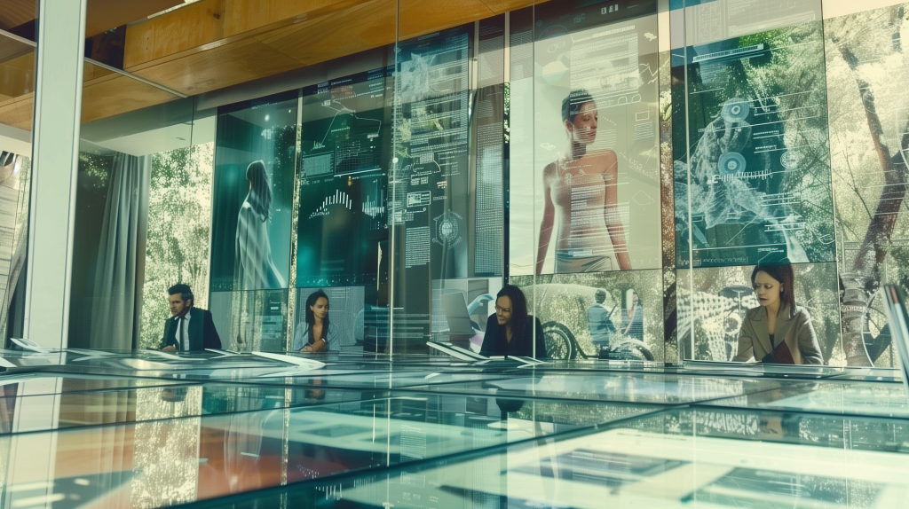 cinematic image of a diverse group of marketers at a digital conference table, engaging with advanced AI screens. The digital displays are vibrant and detailed, showing live updates of consumer behavior analytics.