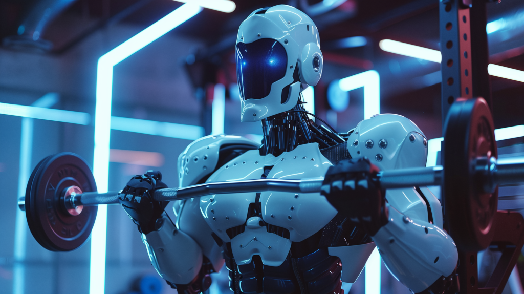 A photographic style of a humanoid robot, glossy white, in the middle of an intense barbell curl in an urban gym. Spotlighting enhances the glossy surface, creating reflections on the nearby equipment.