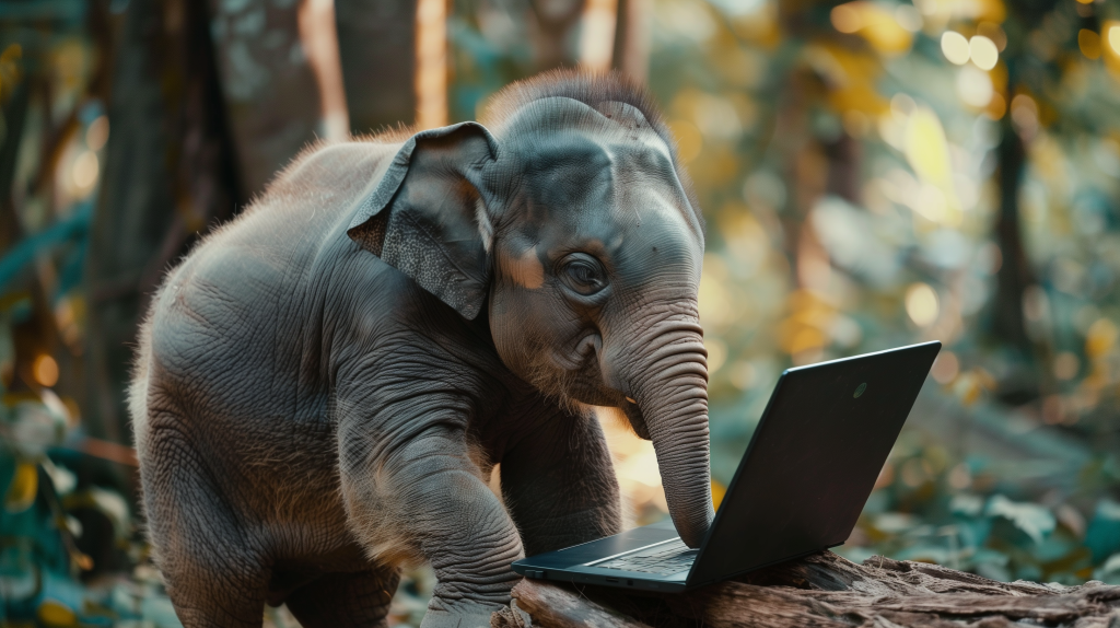 cinematic image of an elephant typing on a laptop computer with its trunk, beautiful nature documentary, bright scenery