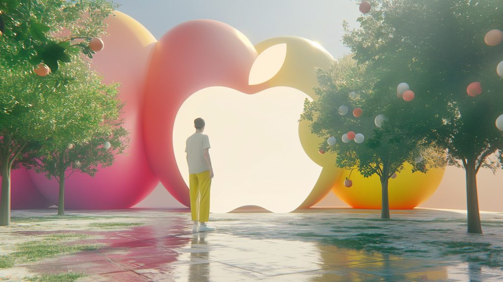 Photorealistic of Apple company release a tons of new AI features. The presenter is standing in a whimsical world with main color is white and with colorful accent colors. The hoster is centered with a big Apple’s company logo behind. The hoster turns his back against the Apple logo, facing the audience. The hoster is standing outside in a meadow with bright sunlight in the morning with shimmering reflections