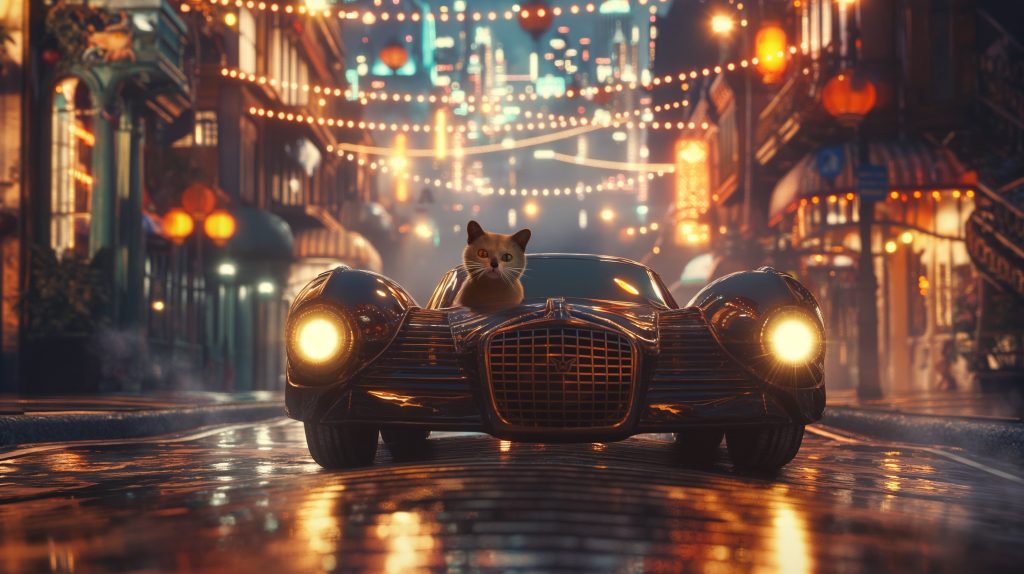 Cinematic action shot of a cat driving a car, speeding away from a massive explosion, action movie, fast-paced, cute clickable cat photo, 35mm film photography, high-speed chase, intense motion blur, dramatic lighting, film grain effect, vibrant colors, dynamic composition, adrenaline rush, suspenseful atmosphere, night scene, neon city lights, cinematic lens flares, dust and debris flying