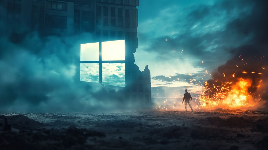 Photorealistic scene of an epic battle between Microsoft’s Window and black hat hackers. The Windows logo should be glowing white from Windows 11. A big Windows logo from Microsoft facing some black hat hacker in the middle of nowhere. Two sides have a big juxtaposition in the scene
