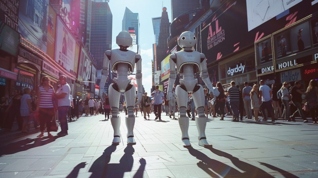 beautiful cinematic shot of two humanoid robots going for a stroll in Times Square, passers-by pay no attention, beautiful sunny day in June, robot friends, 35mm film photography, Kodak Portra 400, film grain effect, dynamic lighting, vibrant colors, bustling crowds, cityscape backdrop, reflective surfaces, lens flare, intricate robot details, human interaction, candid moments, natural shadows, atmospheric depth