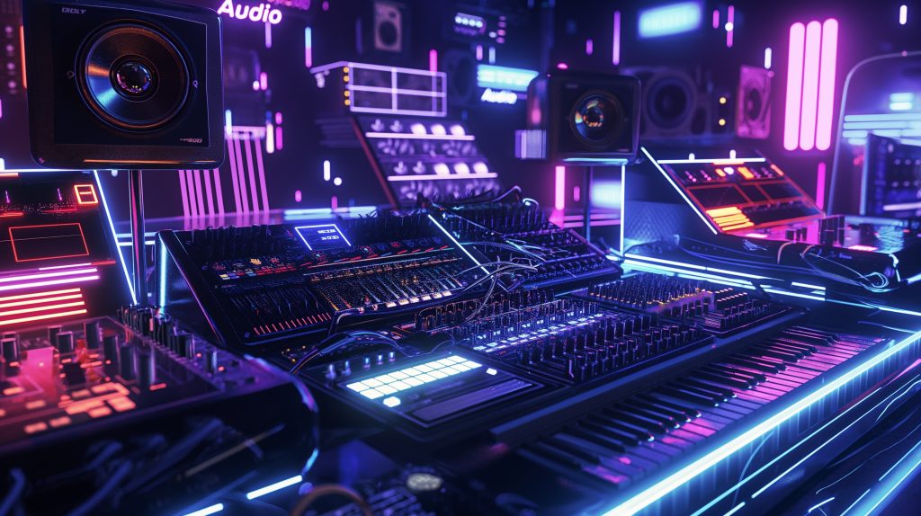 Dynamic digital illustration of Udio’s new “Audio Uploads” feature. A futuristic studio environment with mixing boards and musical instruments. Users are shown uploading their audio clips to remix with AI-generated music. Vibrant, colorful lighting accentuating the creativity. Highlighting Udio’s innovative technology in AI music creation.