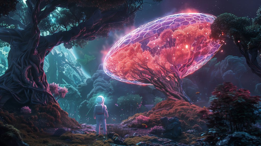 Surreal Bio-Organic Art of a giant, organic-looking synthetic cell membrane integrated into a natural landscape. An AI Robot scientist standing and looking up the tree, observing. A lush, alien forest where the synthetic membrane forms part of the ecosystem. The membrane embedded in a tree, glowing softly, with curious, bioluminescent creatures examining it. Ethereal, glowing light emanating from the membrane, casting an otherworldly glow on the surroundings. Vibrant, oversized flora and fauna interacting with the synthetic membrane, blending science and nature