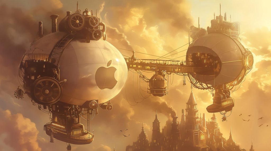 Whimsical Steampunk Illustration of Apple and Meta as anthropomorphic characters – an white APPLE’s company logo airship and a ship with META’s company on it. Floating city in the sky with giant clockwork gears and steam-powered contraptions. Two airships has a bridge connecting each others, represent collaboration, with the floating cityscape and dirigibles in the background. Golden hour light with soft, glowing clouds. Steampunk details like brass goggles, pipes, and mechanical wings