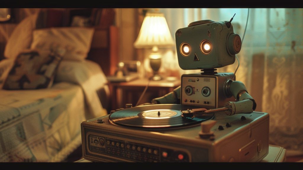 a lonely humanoid robot looking closely at a record player in a drama movie from the 1970s, record player in foreground, record player main focus, 35mm film photography, Kodak Portra 400, warm lighting, vintage interior, retro furniture, melancholic atmosphere, light rays, film grain effect, soft focus, rich color palette, detailed textures, expressive robot, human-like emotions