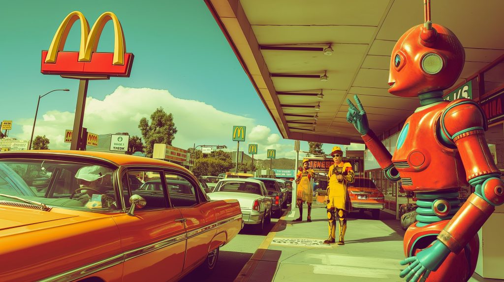 Retro Vintage style photo of an AI robots and McDonald’s staff having a face-off outside the Drive-Thru of McDonald. The scene has exaggerated features and vintage colors. The AI robots on one side, the McDonald’s buyer on the cars on the other, with a chaotic scene of mixed-up orders in the middle. Bright, cheerful lighting with bold outlines, highlighting the interaction challenges