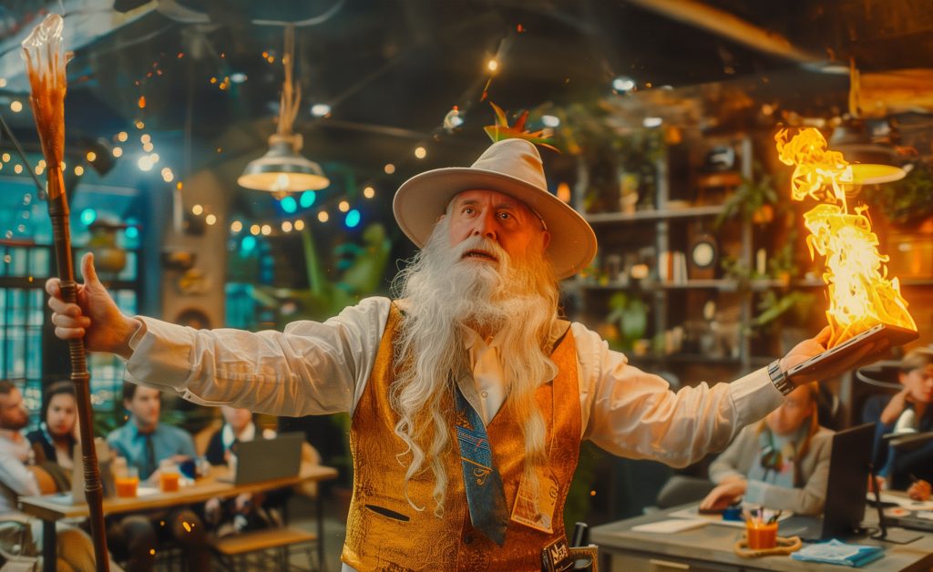 An ancient wizard raises his arms and casts a spell in a modern office as the new CEO. The wizard raises his staff in one hand and raises a laptop in the other hand, walks through the office, cinematic lighting, business suits, modern furniture, contrasting eras, magical aura, mystical symbols glowing on staff, captivating atmosphere, 35mm film photography, Kodak Portra 400, dramatic shadows, awe-struck employees, blending ancient and modern elements