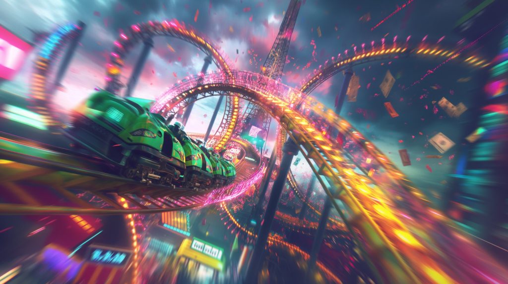 Surreal Digital Art of a rollercoaster with a green NVIDIA logo at the front. A fantastical stock market theme park with vibrant, exaggerated elements. The rollercoaster does a dramatic drop and soaring loop-de-loops in the background. Bright, dynamic lighting with colorful spotlights on the rollercoaster. Stock tickers and dollar signs whizzing around, creating a sense of chaotic movement