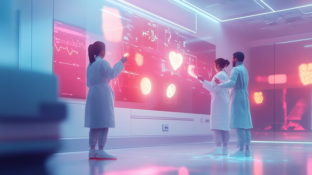 Abstract Minimalism with Dreamlike Elements. A hospital monitor that projects floating, abstract shapes representing patient health, with doctors adjusting these shapes in real-time. A minimalist hospital ICU where the AI projects holographic representations of patient health into the air, and medical staff interact with them like sculptors shaping outcomes. Doctors stand focused, moving their hands through the abstract shapes, adjusting the patterns and colors, while the AI gently shifts them in response to real-time data. Cool, soft lighting highlights the clean, sterile nature of the room, while the abstract holograms glow with warm, reactive hues. The room feels tranquil and orderly, emphasizing the harmony between AI predictions and human decision-making, with no sense of urgency or chaos
