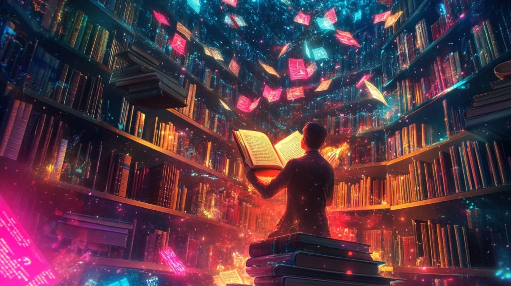 Magical Realism with Bold Colors and Shapes. A narrator splitting into multiple versions of themselves, each holding a different glowing manuscript that reads itself out loud. A vibrant library with endless shelves of glowing, talking books, where each narrator clone reads in perfect synchronization with the AI versions. The central narrator is surrounded by their AI versions, each one interacting with different books as the text comes to life in the air, symbolizing how the voices bring stories into being. Bright, colorful lighting with a neon glow around the manuscripts, making the whole scene feel like a surreal explosion of sound and light. Each clone’s voice is slightly different, but they all radiate the same core energy, representing the narrator’s control over pacing and emotion in the AI-generated audiobooks