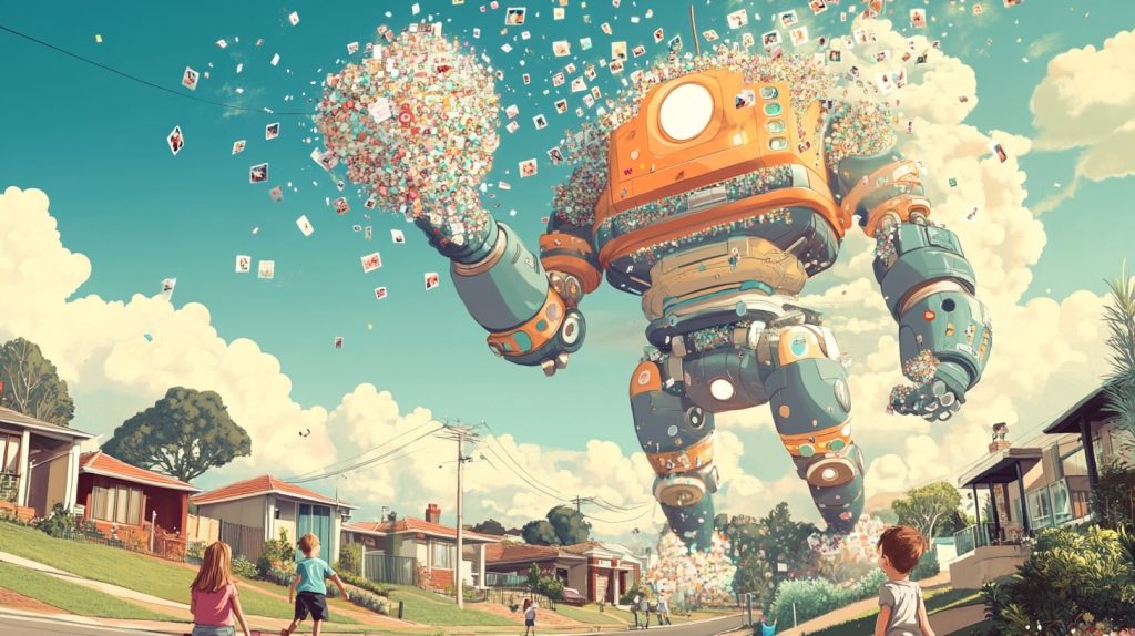 Whimsical Illustration with Playful Patterns. An enormous AI robot cheerfully scooping up clouds of tiny user photos and posts like they were candy from a jar. A bustling Australian suburb, with houses and parks below, as the robot playfully reaches down from the sky, its actions unnoticed by the residents. The AI robot is the main focus, looming large in the frame, while the clouds of user data swirl around it like colorful confetti. Bright and cheerful lighting, almost cartoon-like, with the sun shining playfully over the scene, giving the situation an ironic, light-hearted feel despite the serious subject. A couple of children laugh and play in the foreground, oblivious to the data-harvesting happening above them