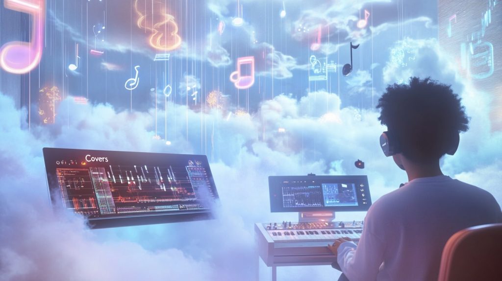Surrealist Musical Dreamscape. A song being transformed into various visual styles, with vibrant notes morphing into different instruments and artistic elements mid-air. A fantastical floating music studio surrounded by colorful, shifting clouds where musical notes turn into abstract shapes, transforming into jazz, rock, and classical instruments as they float. In the foreground, a user interacts with an ethereal music interface, with swirling patterns of melody shifting into new genres behind them. Soft, glowing light from the instruments and notes, creating a sense of continuous flow and transformation in the misty, dreamlike atmosphere. The entire scene feels fluid and whimsical, capturing the magic of music being reinvented in real-time through Suno AI’s “Covers” tool