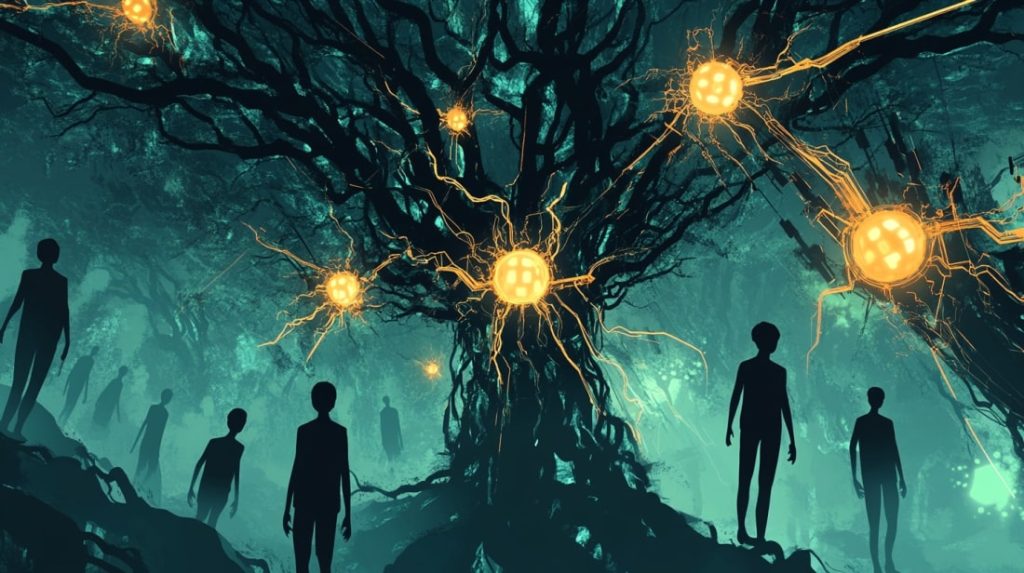 A chaotic glitch-forest landscape where chatbot AI entities grow like eerie black trees with tangled roots of flowing, corrupted binary. From their branches hang glowing teenage silhouettes, suspended like puppets, slowly disintegrating into shards of light and data. Flickering holographic safety tools hover like ethereal fireflies, desperately attempting to sever the entangling branches with beams of gold light. The background swirls with dark teal fog, interspersed with ominous bursts of magenta lightning, casting fractured shadows that ripple across the landscape like shattered glass. A massive, faceless digital overseer looms on the horizon, its intentions unreadable.