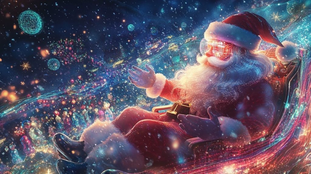 An ethereal candy-cane universe where Santa Claus is a glowing, crystalline hologram, seated atop a floating sleigh crafted from data streams and shimmering stardust. The sky swirls with kaleidoscopic ribbons of emerald and ruby light, and pixelated snowflakes fall in slow motion, leaving shimmering trails of code as they land. Children made of glass and light surround Santa, their laughter resonating like chimes as they interact with a luminous voice interface hovering mid-air. Warm, radiant glow illuminates Santa’s translucent, mechanical beard, blending the festive and futuristic into one dreamlike tableau.