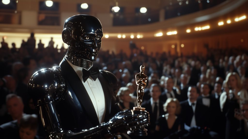 A humanoid robot in a black tuxedo is holding a prestigious golden trophy on stage at an awards ceremony, surrounded by an audience dressed in formal attire. The scene exudes sophistication and futuristic elegance, blending technology with tradition.