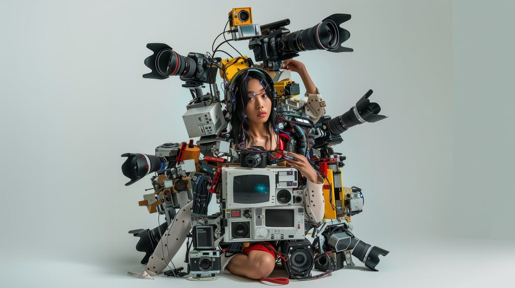 A woman sits at the center of the image, surrounded by an intricate and chaotic structure made of cameras, lenses, and other recording equipment. The cameras and devices are assembled to resemble a robotic suit or exoskeleton, with multiple lenses and screens positioned like mechanical arms and body parts. The woman, calm and focused, looks directly at the viewer, adding a sense of control amidst the overwhelming technology. The setting is clean and minimalistic, with the futuristic theme emphasizing a blend of humanity and machine.