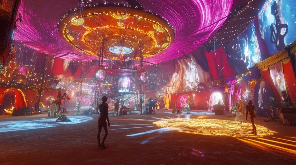 A sprawling machine-dream circus on the edge of a fractal desert, where vibrant AI-powered tents stretch endlessly, blending Victorian carnival aesthetics with futuristic glitches. Inside a central tent, a rotating carousel powered by golden gears spins images uploaded by users, weaving them into vivid living videos projected onto enormous silk canopies. Jugglers made of liquid light toss characters and objects into perfect loops of motion, while shimmering spotlights flicker erratically, casting rainbow-hued ripples on the desert sands as the videos unfold like moving storybook paintings.