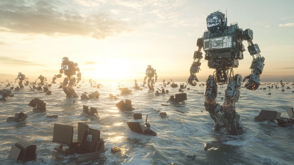 A dreamlike ocean of discarded desks and chairs, floating aimlessly on waves made of flowing binary code, where monumental AI titans rise from the deep—gargantuan beings of metallic fluid and holographic threads, their movements unnaturally smooth. Each titan carries an entire glowing digital office embedded into its torso, buzzing with automated tasks. In the distance, faint echoes of typewriters and whispered conversations drift across the air, while broken cubicles drift like flotsam. Sunlight filters through a fractured sky of molten gold and cobalt, casting endless reflections onto the undulating sea of forgotten labor.
