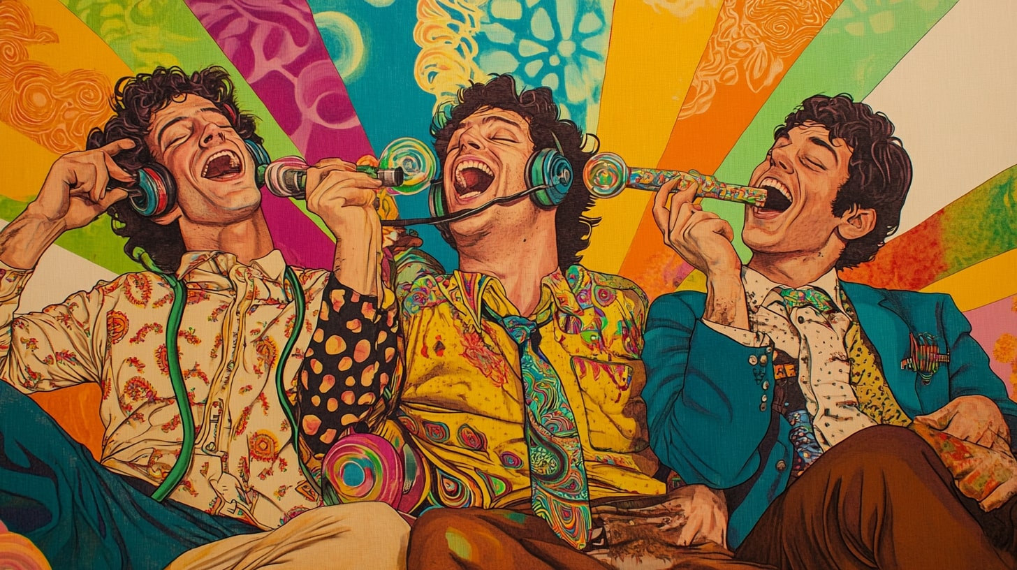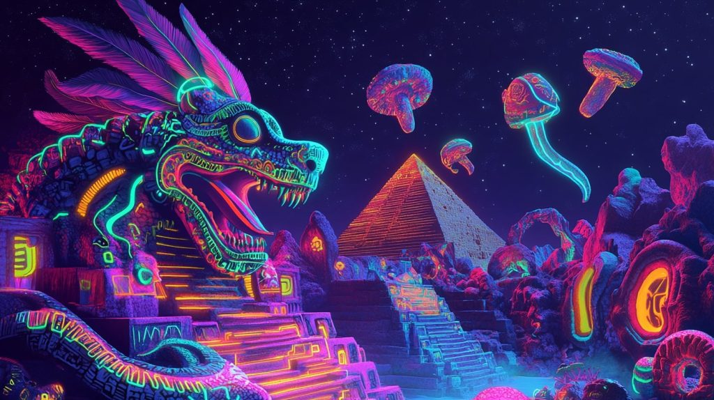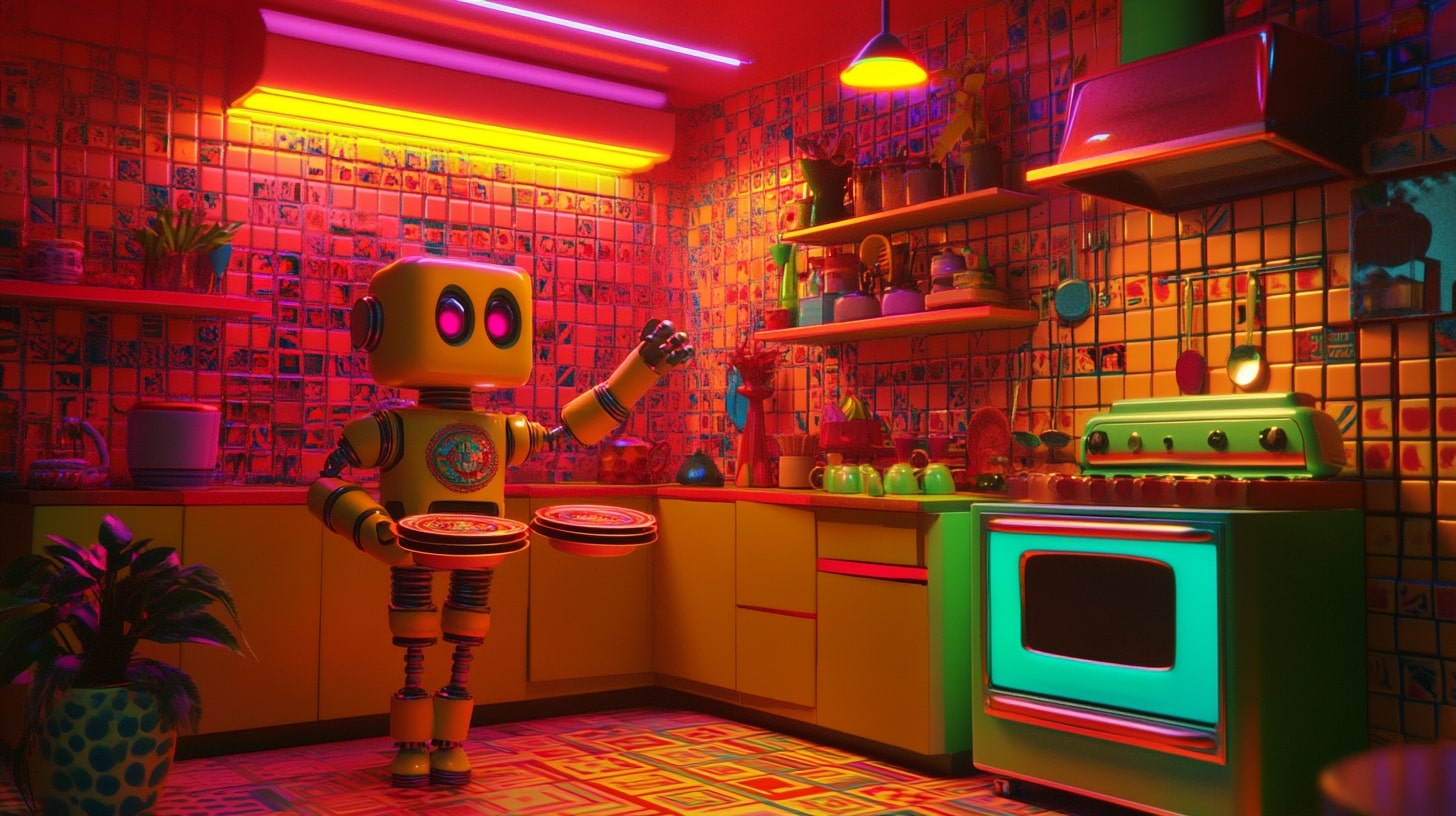 Inca textile patterns fused with 1930s rubber-hose animation and lava lamp aesthetics, a stretchy-limbed robot juggling plates shaped like Aztec gods, trippy geometric kitchen backdrop with glowing avocado-green appliances, disco ball light refracting through gelatinous cleaning bubbles, one robot finger stuck in a toaster.