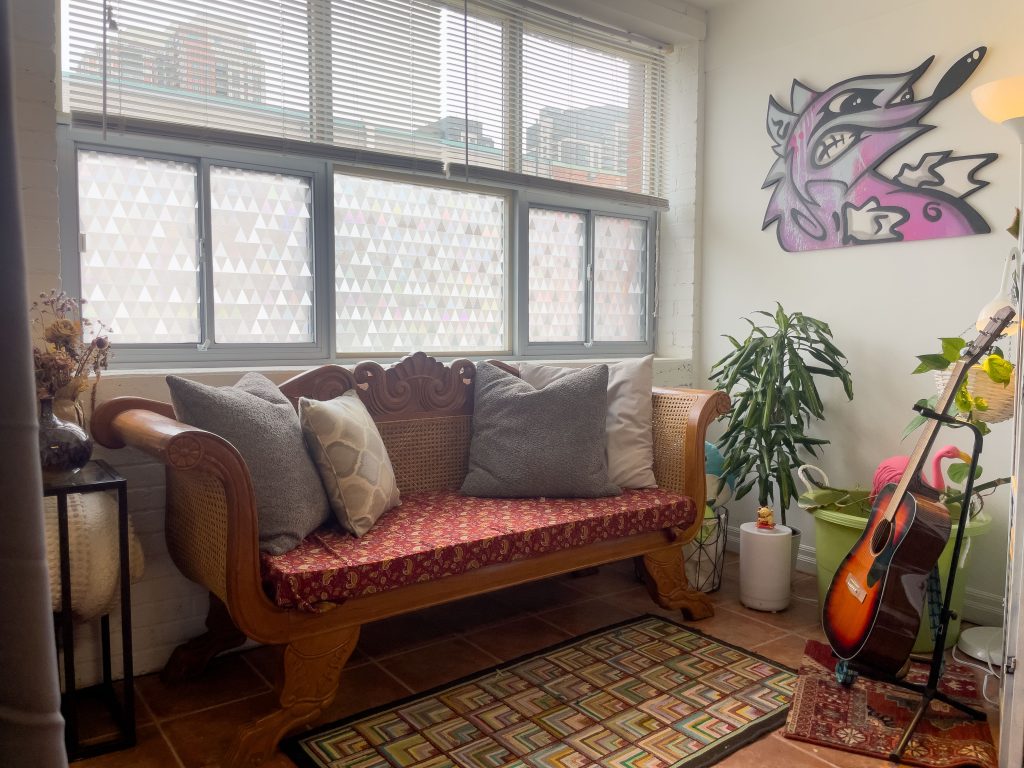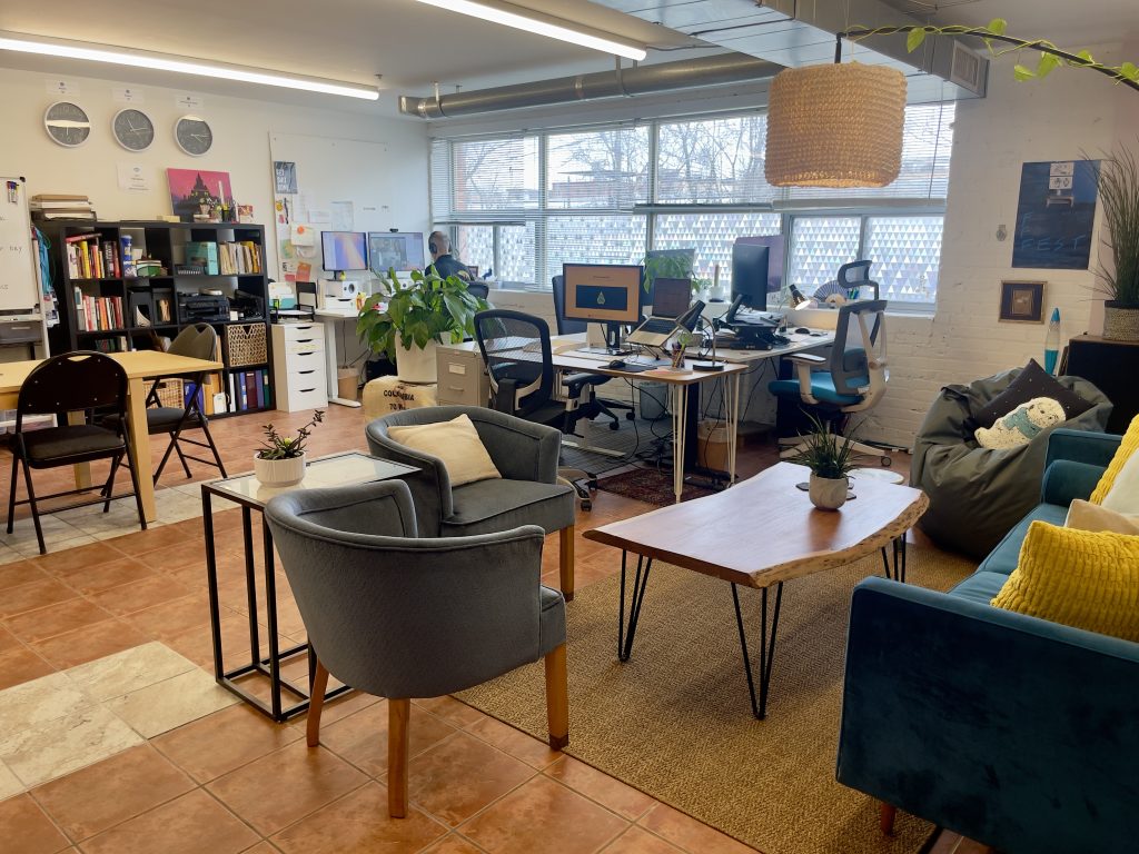 The conference room, which is painted a bright teal, is designed to foster deep conversations and inspire productive meetings. Meanwhile, the lounge area encourages relaxation and casual brainstorming with a cheerful palette and soft textures. Our east-facing windows flood the space with natural light throughout the day. To help balance creativity with privacy, we applied prism-patterned frosted vinyl to the windows that casts subtle rainbow hues across the space—creating both visual inspiration and functional screening.