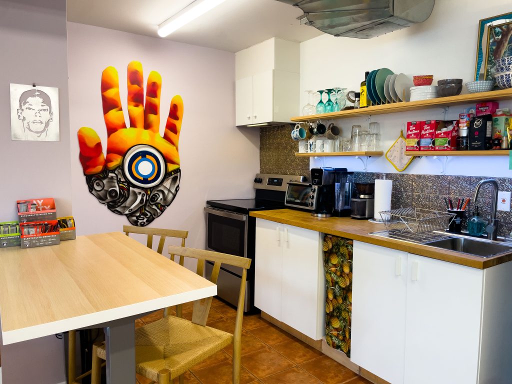 The building and surrounding area are a place where start-ups, artists, and innovative businesses of all kinds have gathered. Our neighbours are incredibly inspiring and we feel the energy of the area when we walk through the halls, grab coffee from down the street, or jet out for a meal at one of the newly opened restaurants nearby. Being in this area is keeping us in the know about what’s happening in culture within the city because it is one of the places where artistry, entrepreneurship, and technology meet in a big way.