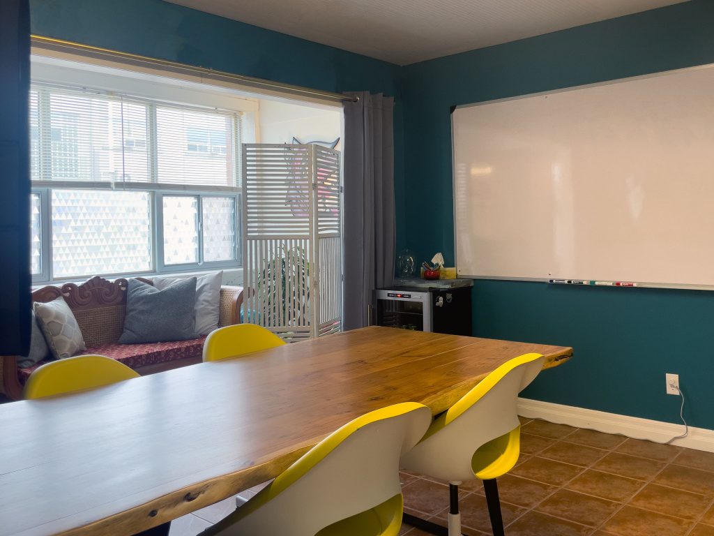Whiteboards line the walls, ready for impromptu ideation or planning sessions. Gifted fine art and unique mementos from collaborations and travel jobs line the walls. There are also ample live plants throughout, which add vibrancy to the workspace along with creating more breathable air.