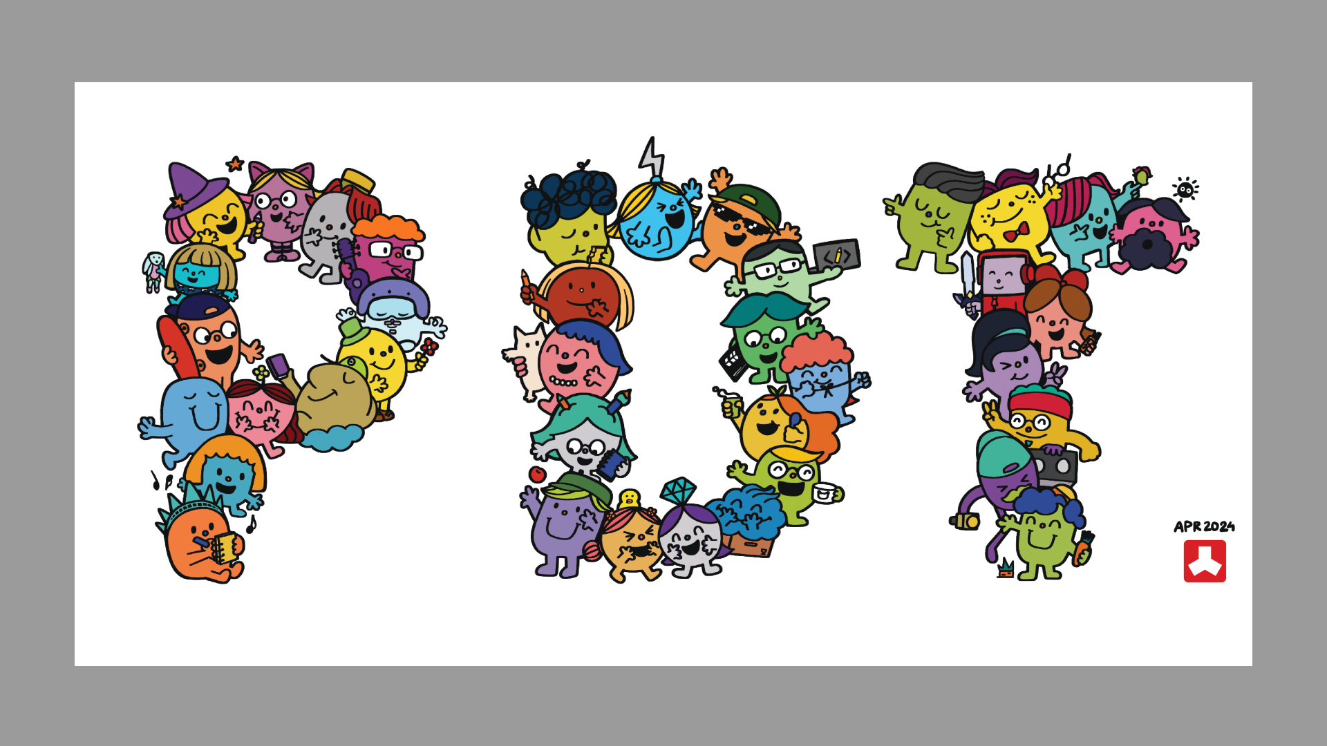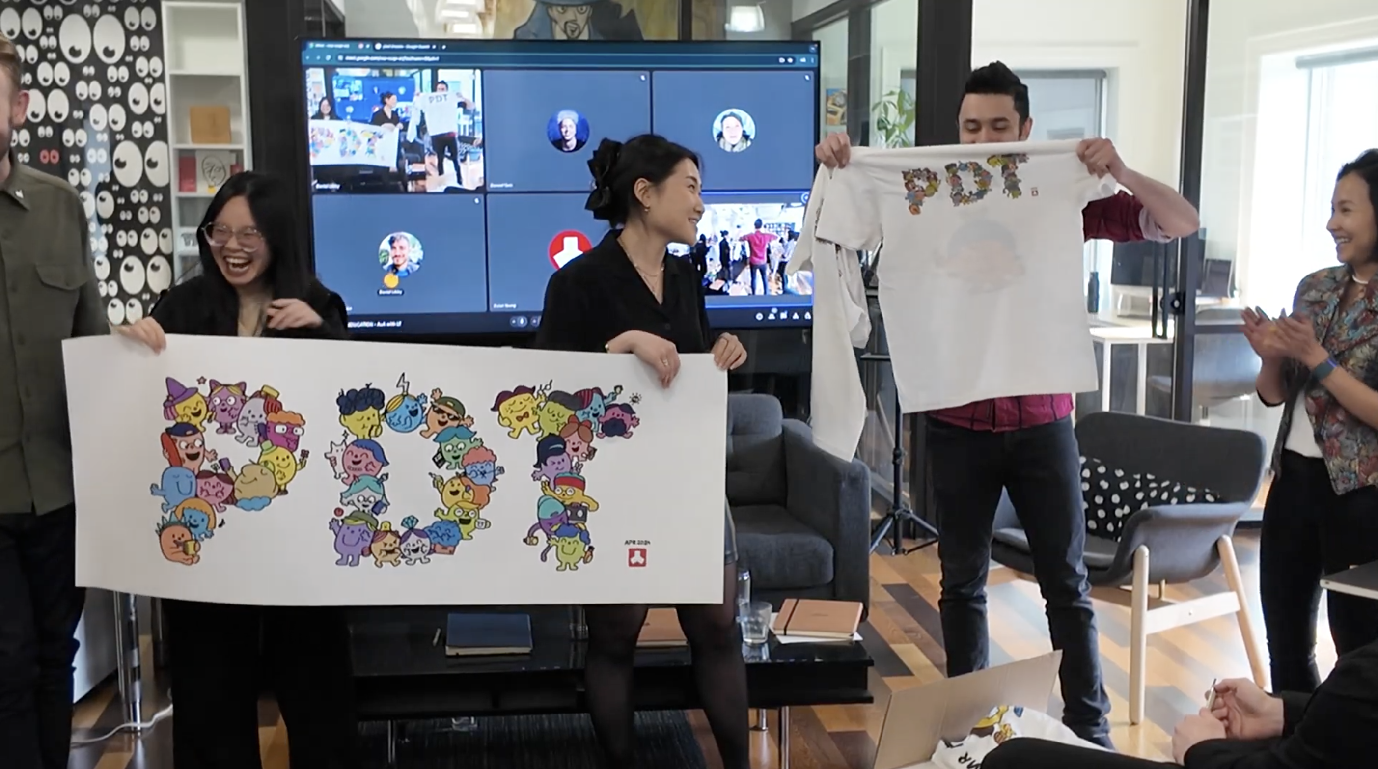 The characters would join together in a motley mosaic spelling out “PDT,” representing the team through its individual parts. Every PDTer would receive a t-shirt with these custom creatives to wear at the party.
