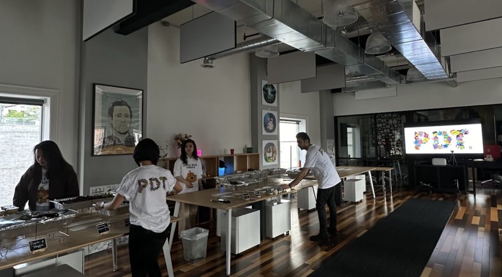 It was time to rally the troops and get the party vibes rolling. After changing into their PDT tshirts, the team got to tidying desks, stowing away monitors, setting up lights, and switching over to party mode.