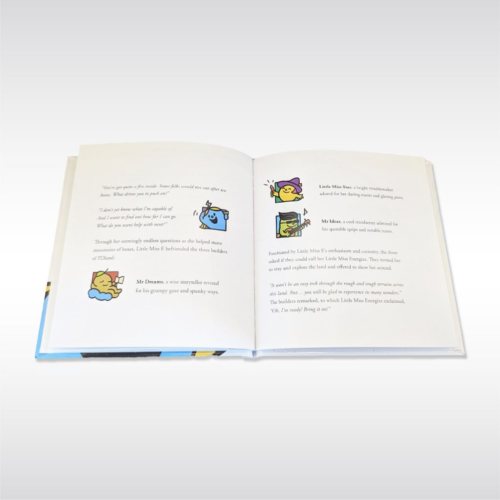 The special surprise for Energize would be Sarah’s own Little Miss Energize extended merch line and, of course, a storybook. The story and art would be based on Sarah’s PD journey, set in the universe of Little Miss Energize. A read-along video would be shown at the party, bringing everyone together to celebrate Little Miss Energize’s anniversary.