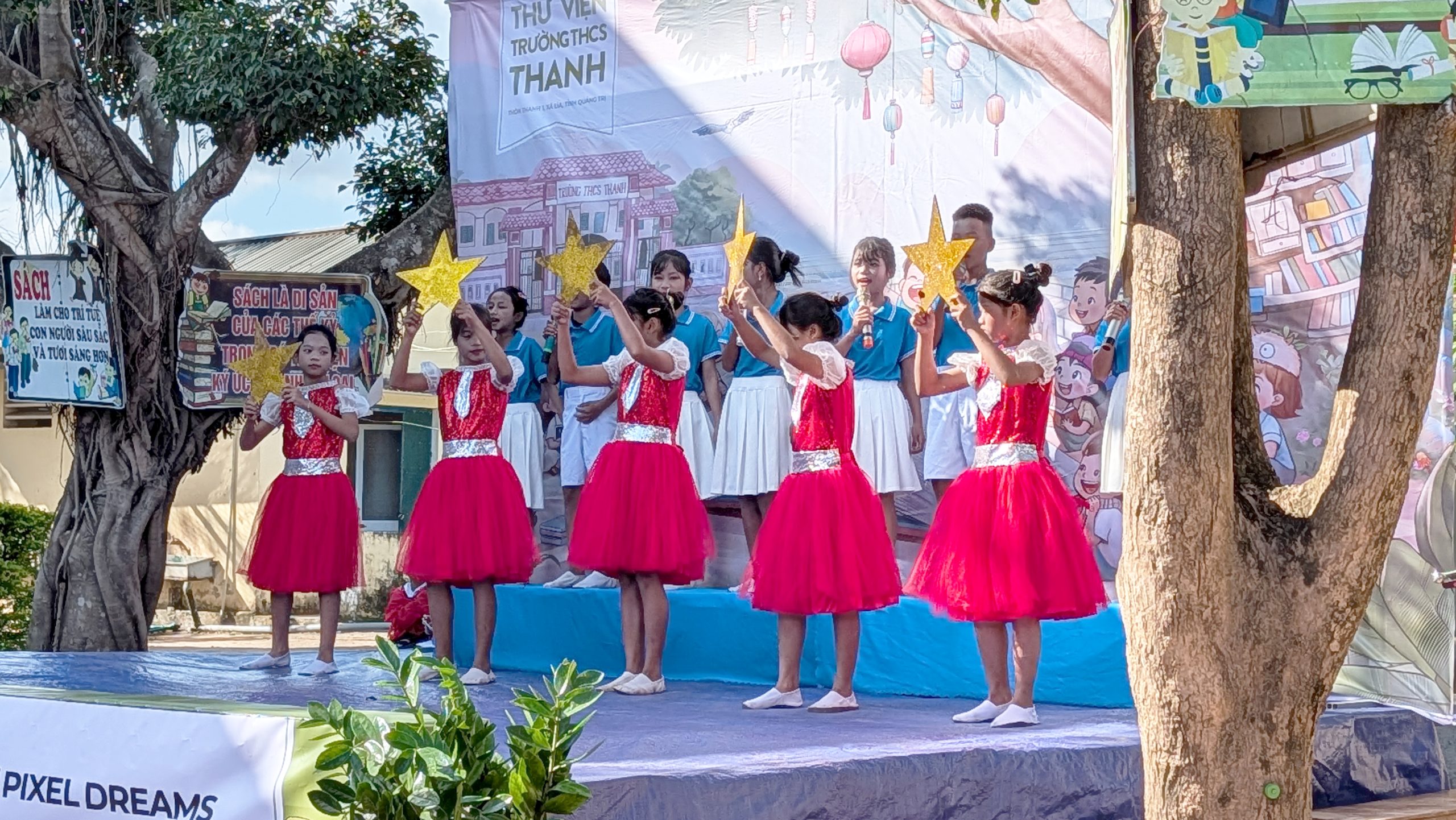 The next morning, we gathered at Trường THCS Thanh for the groundbreaking ceremony. Students took the stage wearing the traditional dress of their respective ethnicities while performing the contemporary pop song Di giua troi ruc ro. The song speaks to youthful aspiration, freedom, and self-discovery. Its lyrics encourage young people to overcome hardship, live fully within the moment, and carry a deep love for their homeland.