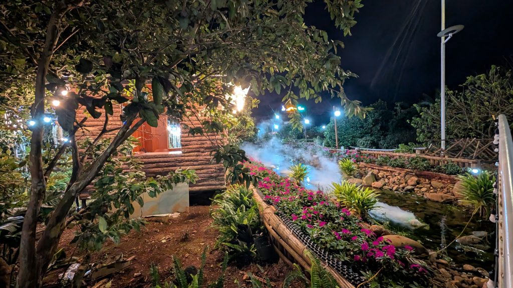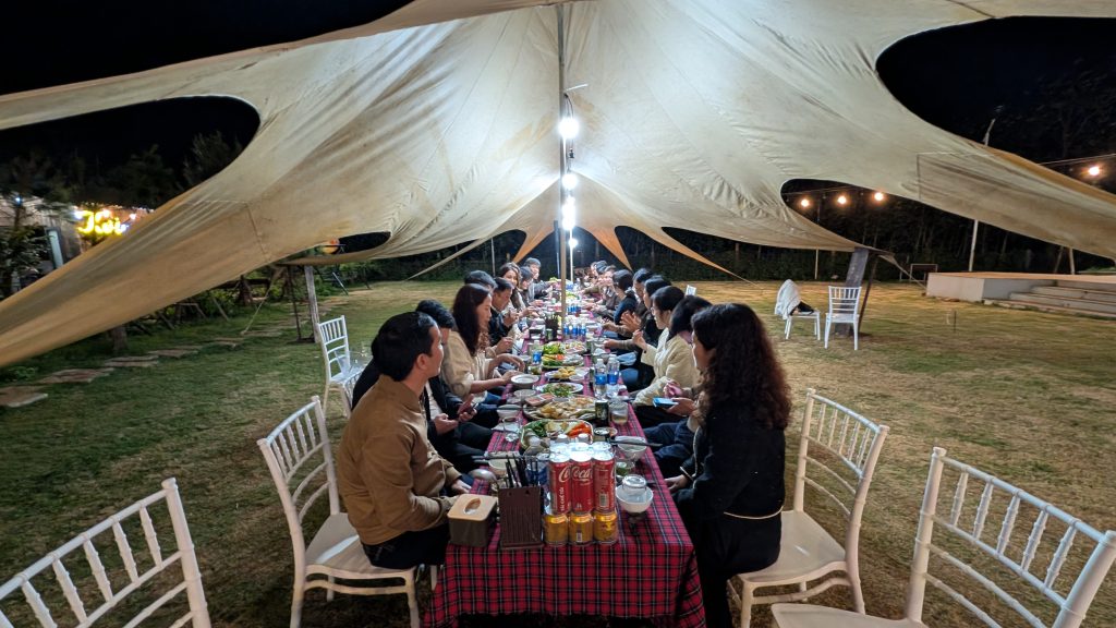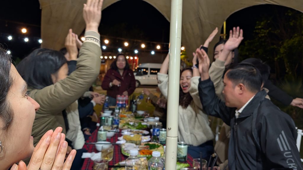 By early evening, we were welcomed with warmth and celebration by local teachers and officials at a party held at the Koi Farm inside Bảo An Viên. The night was filled with singing — and not just casual karaoke. Everyone had amazing voices, singing fast-paced local songs that, as we later learned from the principal (translated by Jenn), reflect a unique regional tradition. These quick tempos are a cultural trait of the area, known for producing strong, resilient people. Music here isn’t just entertainment — it’s woven into their identity.