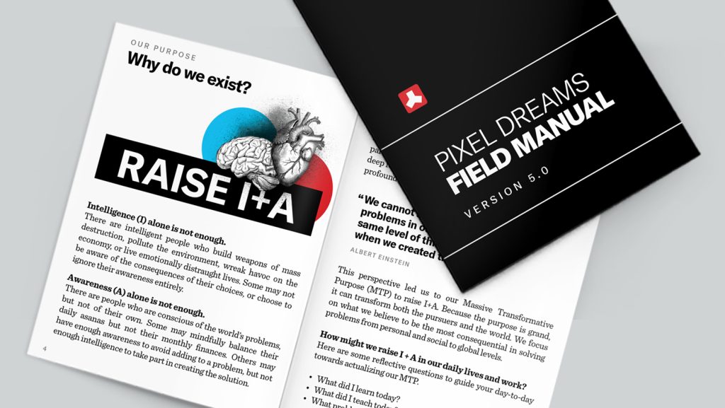 Every great team needs a playbook. At Pixel Dreams, our Field Manual is a living document that keeps our purpose, missions, values, and best practices clear for everyone. The manual aims to bring alignment, consistency, and high standards across the company.