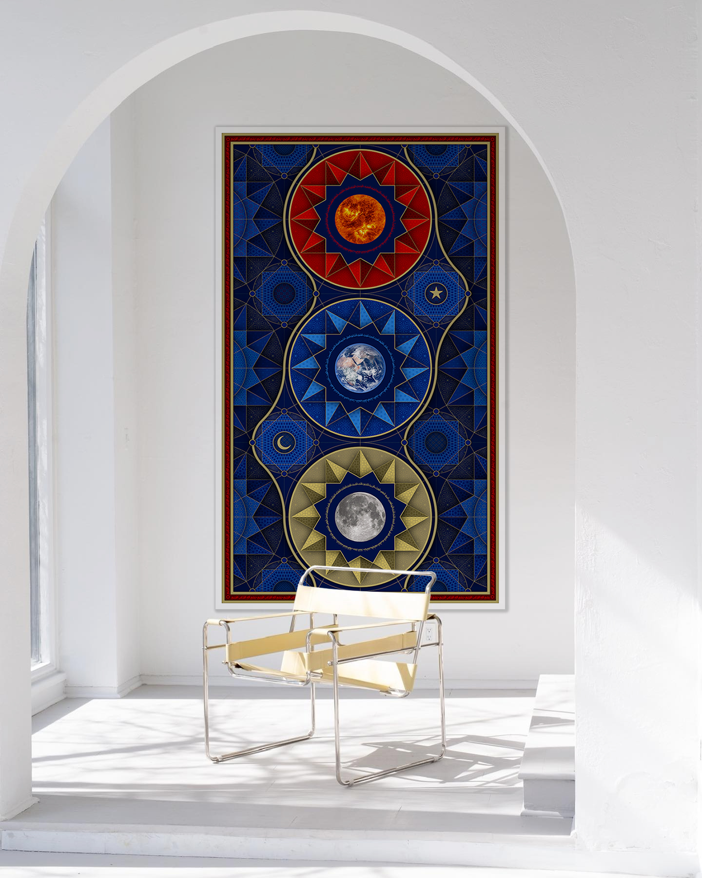 The Crescent Star, representing the moon and the sun. As observers, we (Earth) are at the center. A medley of geometric patterns, most based on patterns found in the Islamic world. Inspired by Islamic history, architecture, geometry and pattern-making.