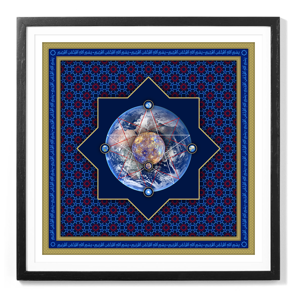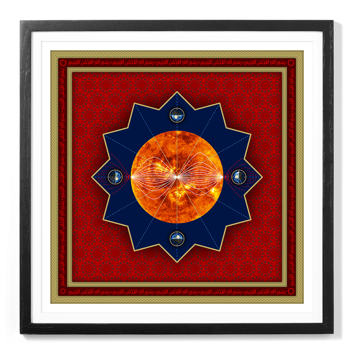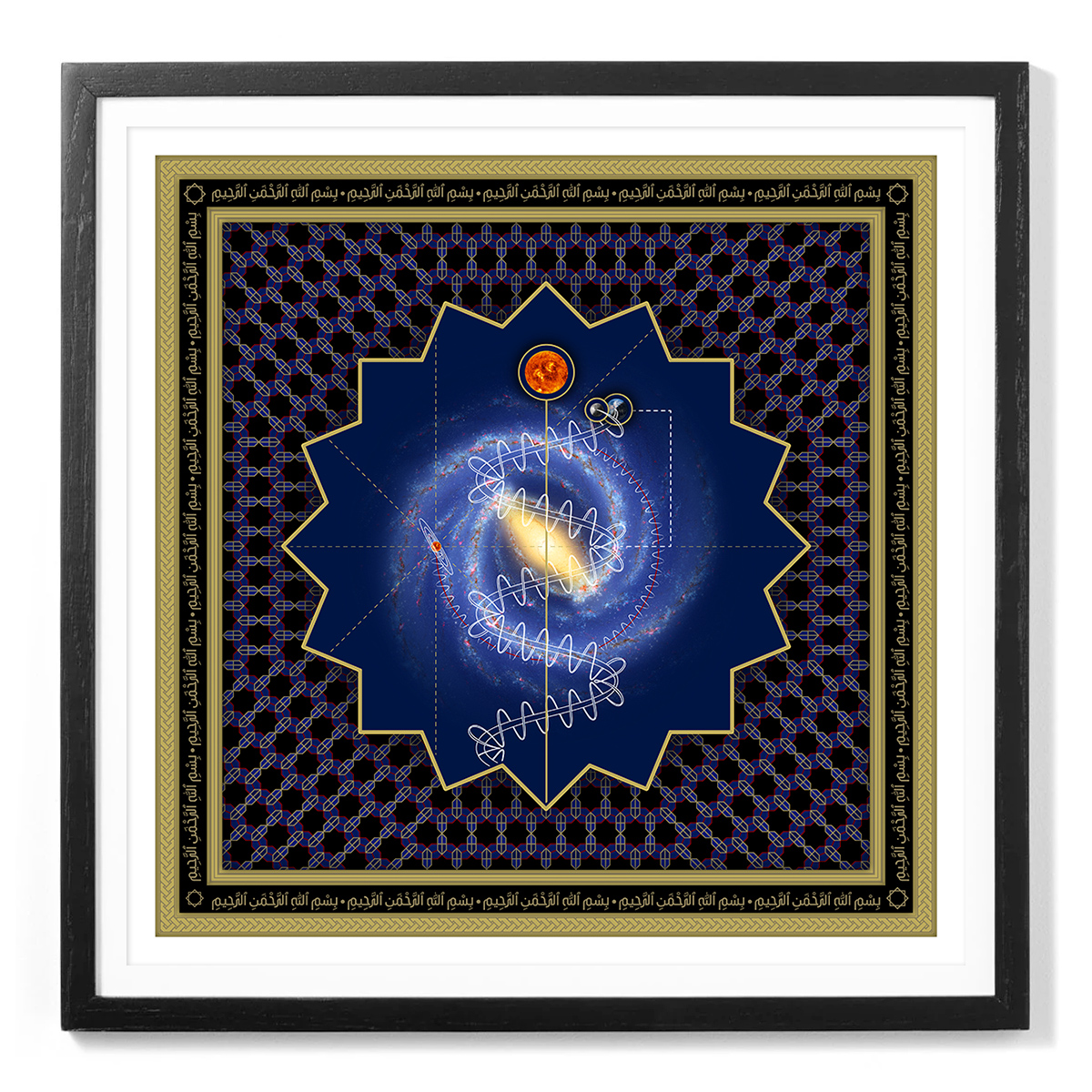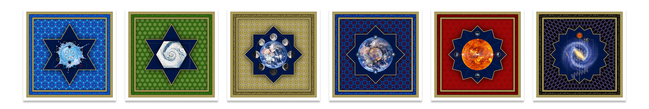 This series explores the infinite micro to the infinite macro from the lens of Islam. There are many ways to “trip out”. One method for Muslims to take a cosmic trip is through intense meditation and prayer. In the following six pieces, the artist examines the mathematical relationships between the micro and the macro, diving deep into numbers, shapes, and patterns.