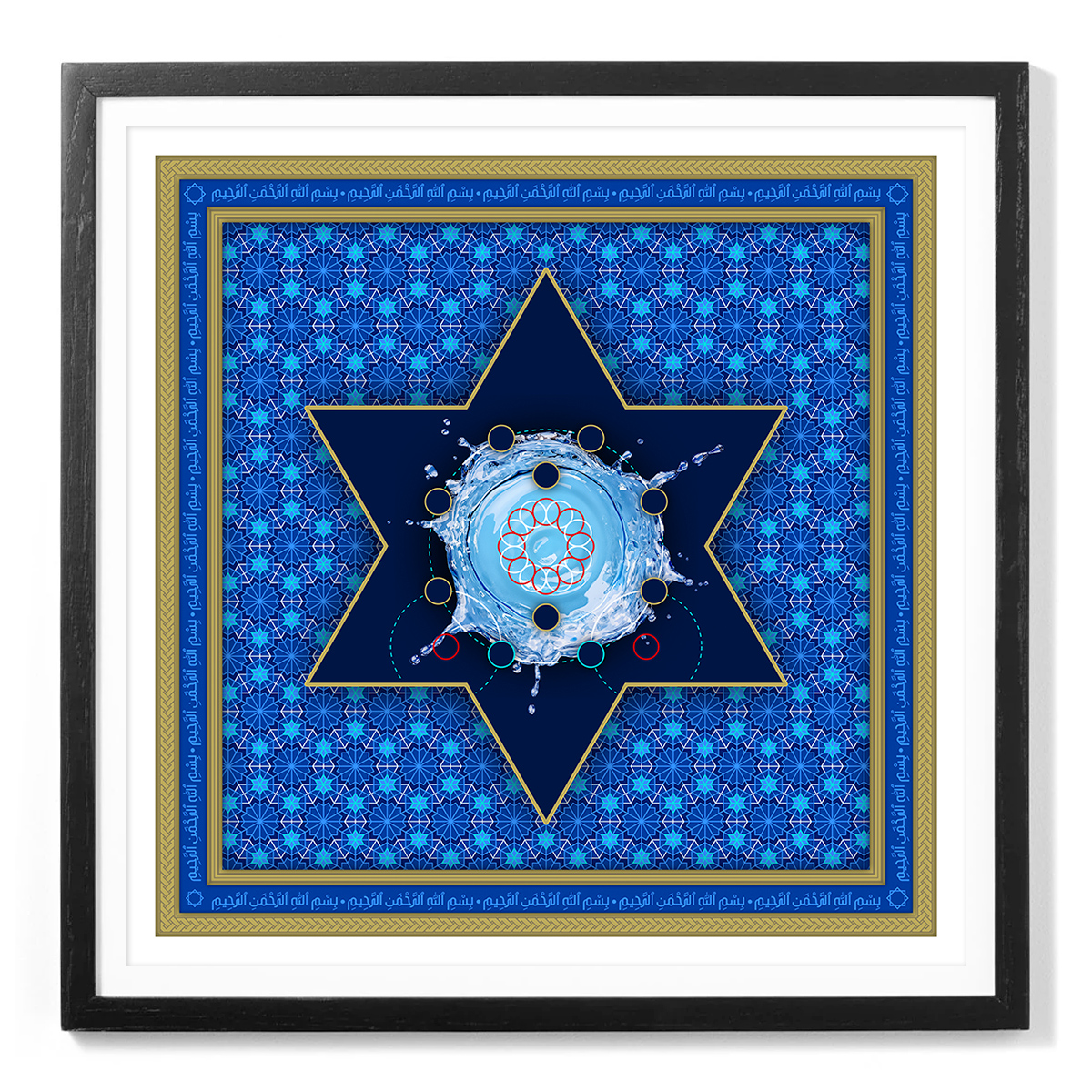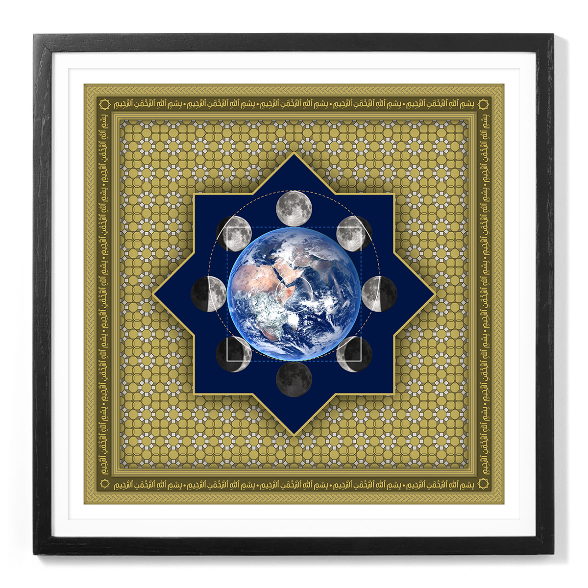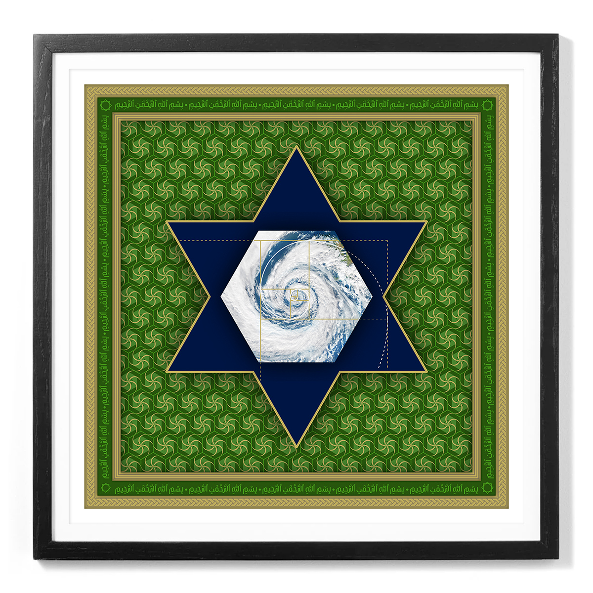 This series explores the infinite micro to the infinite macro from the lens of Islam. There are many ways to “trip out”. One method for Muslims to take a cosmic trip is through intense meditation and prayer. In the following six pieces, the artist examines the mathematical relationships between the micro and the macro, diving deep into numbers, shapes, and patterns.