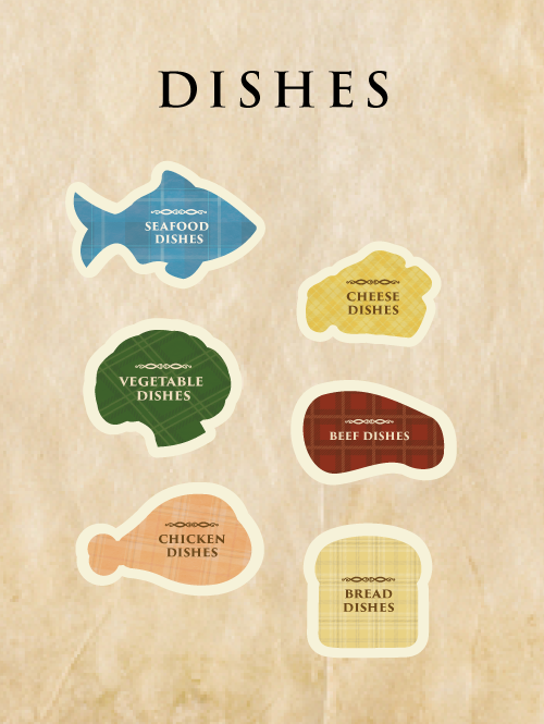 Cocktail menu with thematic drink names and some examples of food and creative naming that were included in the buffet
