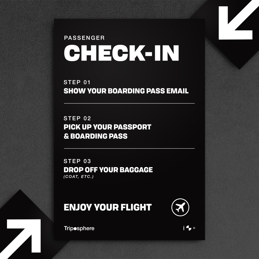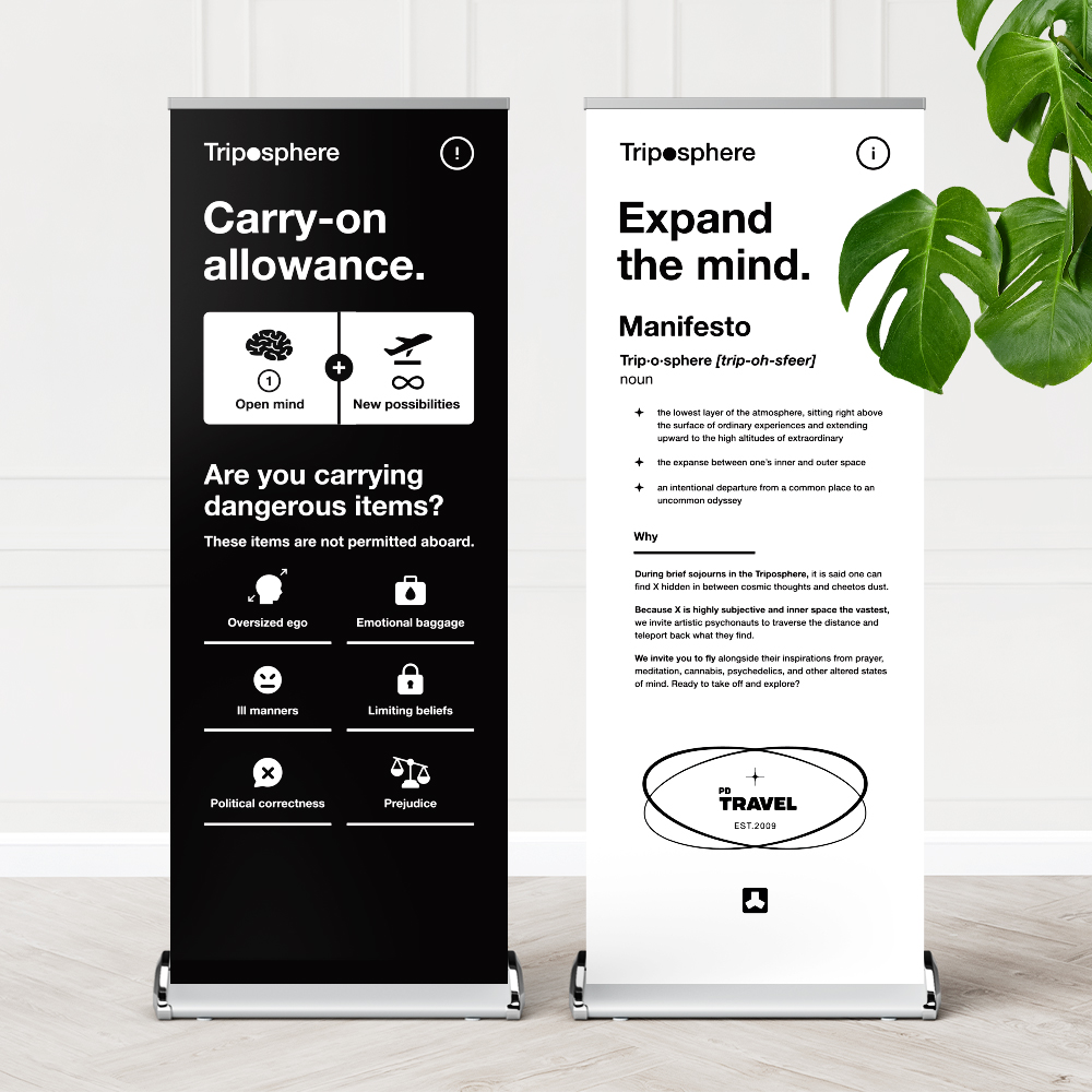 Inspired by airports and passports, the event visual identity was black, white, and a splash of funk. It was important that the event branding was a backdrop to the colourful and exciting art being showcased. For this, we kept a minimal palette and font choice.
